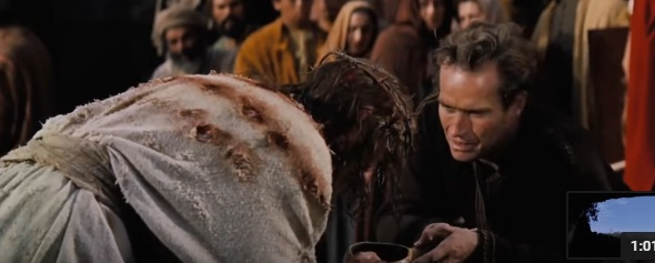 주인공 유다 벤허는, 십자가를 지고 골고타('해골터'라는 뜻) 언덕을 힘겹게 올라가는 예수께 물을 채운 표주박을 내밀었다. 그러나 로마 군사의 거친 저지로 물을 엎지르고 말았다. 유다 벤허가 노예선으로 끌려갈 때 물을 먹여주던 바로 그 남자, 예수께 물 한 바가지 보답코자 했지만 그 하찮은 뜻조차 물거품이 된 것이다.