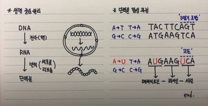 단백질은 100개 이상의 아미노산으로 구성된 폴리텝티드다. 전사(transcription)와 번역(translation)을 거쳐 단백질이 합성된다.