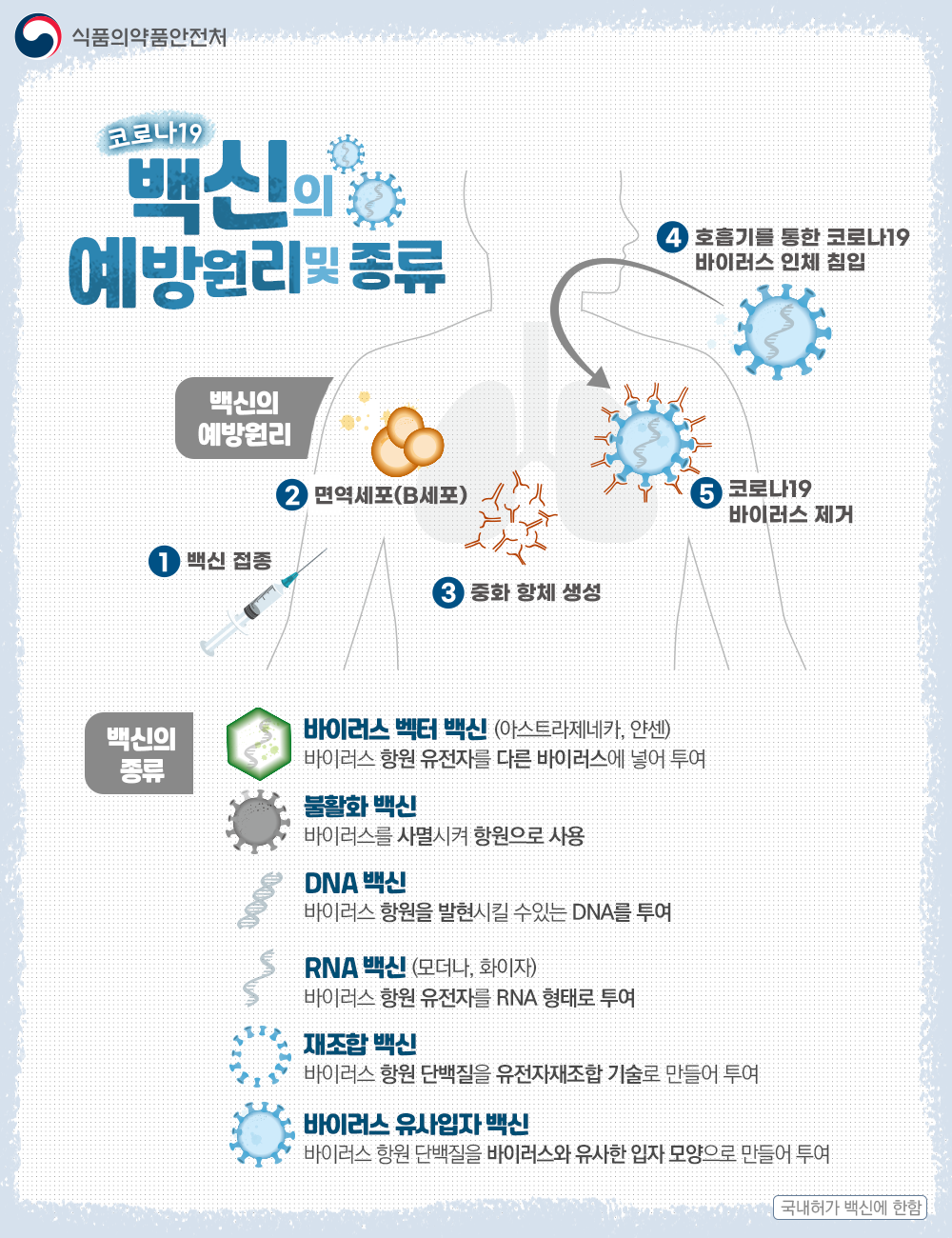 | <백신의 예방 원리> 백신 접종-면역세포(B세포)-중화 항체 형성-호흡기를 통한 코로나-19 바이러스 인체 침입-코로나-19 바이러스 제거 <코로나 백신: 총 6종> 1. 바이러스 벡터 백신(아스트라제네카, 얀센) - 바이러스 항원 유전자를 다른 바이러스에 넣어 투여 - 코로나19 바이러스의 표면항원 유전자를 다른 바이러스(아데노바이러스 등) 주형에 넣어 주입, 체내에서 표면항원 단백질을 생성함으로써 면역 반응을 유도함 - RNA 백신에 비해 열에 안정적인 특성이 있음. 하지만 살아 있는 아데노바이러스를 사용하므로 생백신의 경우(섭씨 4도)에 준하는 콘드체인이 필요함. 2. 불활화 (바이러스) 백신(중국의 시노팜, 시노백) - 바이러스를 사멸시켜 항원으로 사용 - 사멸시킨 코로나19 바이러스를 체내에 주입, 면역반응을 유도함 - 전통적인 백신 플랫폼(기반기술, Platform technology)임. 감염 바이러스 확보 시 신속한 개발이 가능하며 제조 방법이 단순하고, 중화 항체 유도가 우수한 게 특징임. 그러나 코로나19 바이러스의 경우 생물안전등급 BL3급의 생산시설이 있어야 됨. - 불활화 백신으로는 A형 간염 백신, 주사용 소아마비 백신, 일본뇌염 사백신 등이 있음. 3. DNA 백신(아스트라제네카-옥스퍼드/미국 이노비오) - 바이러스 항원을 발현시킬 수 있는 DNA 투여 - 코로바19 바이러스의 표면 항원 유전자(DNA)를 주입, 체내에서 표면항원 단백질을 생성, 면역반응을 유도함. 4. RNA 백신(모더나, 화이자) - 바이러스 항원 유전자를 RNA 형태로 투여 - 코로나19 바이러스의 표면항원 유전자를 RNA 형태로 주입, 체내에서 표면항원 단백질을 생성함으로써 면역 반응을 유도함. - 제조기간이 짧아 단기간 내에 대량생산이 가능함. 그러나 RNA 분해효소에 주성분인 RNA가 쉽게 분해돼 안정성이 나쁨. 따라서 냉동(섭씨 영하 20도 또는 영하 75도±15도)의 콜드체인이 필요함. 코로나19 백신이 이 방식으로 처음 제품화됨. 5. 재조합 백신/재조합 단백질 기반 백신(노바백스/사노피-GSK) - 바이러스 항원 단백질을 유전자재조합 기술로 만들어 투여 - 유전자재조합 기술을 이용해 만든 코로나19 바이러스의 표면항원 단백질을 직접 주입, 면역 반응을 유도함. - 가장 많이 사용되는 백신 플랫폼에 속하며 재조합 항원 단백질만으로는 면역 반응이 낮을 수 있기 때문에 일반적으로 면역증강제(알루미늄염 등)가 포함된 제평이 필요함. 오래 사용할 수 있는 안전성 높은 백신임. - B형 간염 백신, HPV(자궁경부암 백신) 등이 있음. 6. 바이러스 유사입자(VLP) 백신(인도 혈청연구소) - 바이러스 항원 단백질을 바이러스와 유사한 입자 모양으로 만들어 투여 - 코로나19 바이러스 표면항원 단백질을 바이러스와 유사한 입자 모양으로 만들어 주입, 면역 반응을 유도함. |