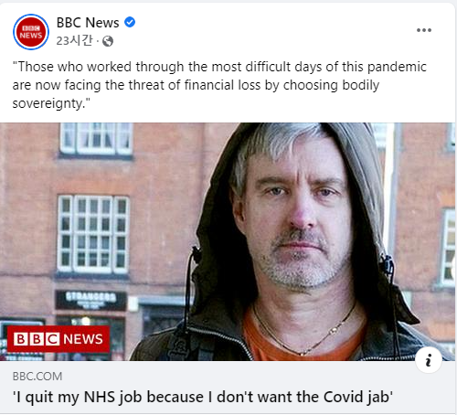 1. '신체 주권(bodily sovereignty)'이라는 표현을 오랜 만에 본다. 우리나라의 국민건강보험에 해당하는 영국 보건의료시스템(NHS)의 남성 직원이 코로나19 예방접종을 하기 싫어 직장을 그만둔다는 내용의 기사가 영국 공영방송 BBC에 나왔다.