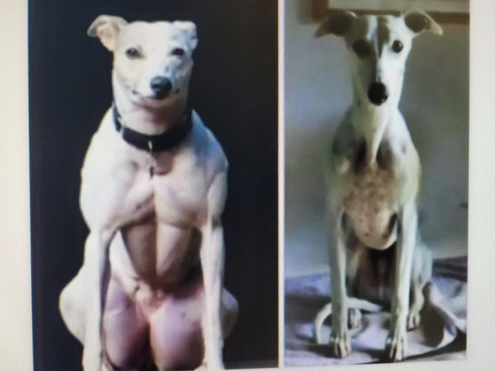 조작한 유전자 마이오스타틴(myostatin)을 주사한 개(왼쪽 사진)와 주사하지 않은 개(오른쪽 사진).