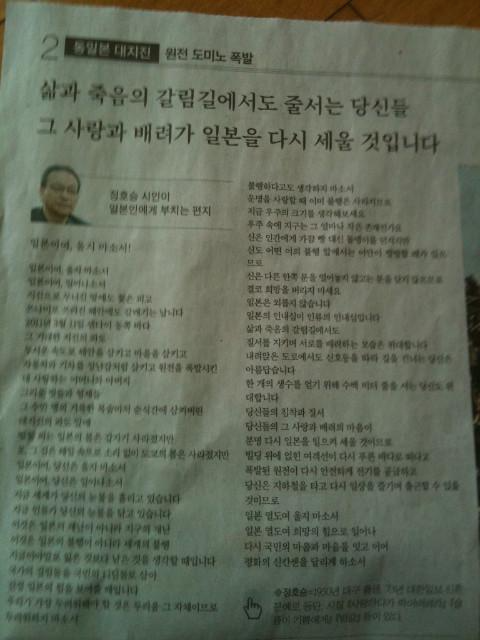 정호승 시인이 기고한 글을 읽으면서 일본의 사후 상흔이 최소화되기만을 애타게 기도할 따름이다.